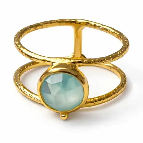 Crafted with love and care by skilled artisans, this ring features a stunning semi-precious stone wrapped in luxurious gold. The oxidized sterling hammered band adds a touch of texture and depth, making this ring truly one-of-a-kind.