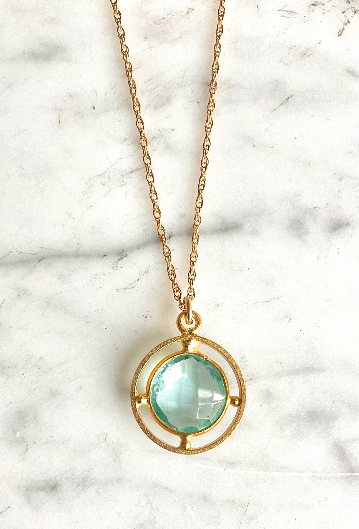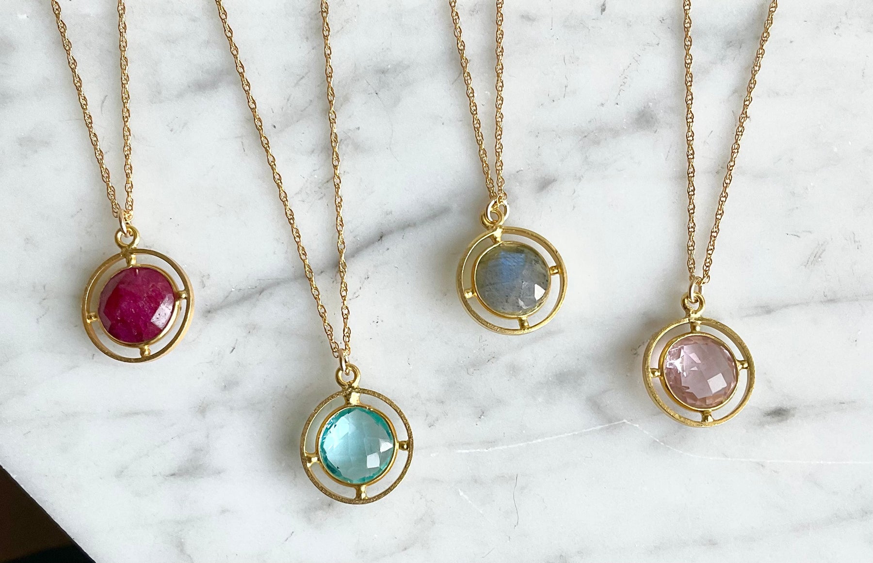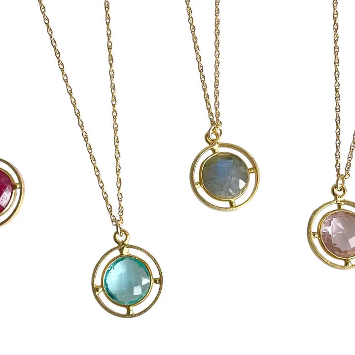 14K gold fill chain pendant necklace with semi-precious faceted stone gold over sterling pendant. Available in blue topaz, labradorite, ruby, and morganite. Pendant measures 5/8 of an inch, with the center stone measuring almost 1/2 of an inch. Necklace measures 16" in length.